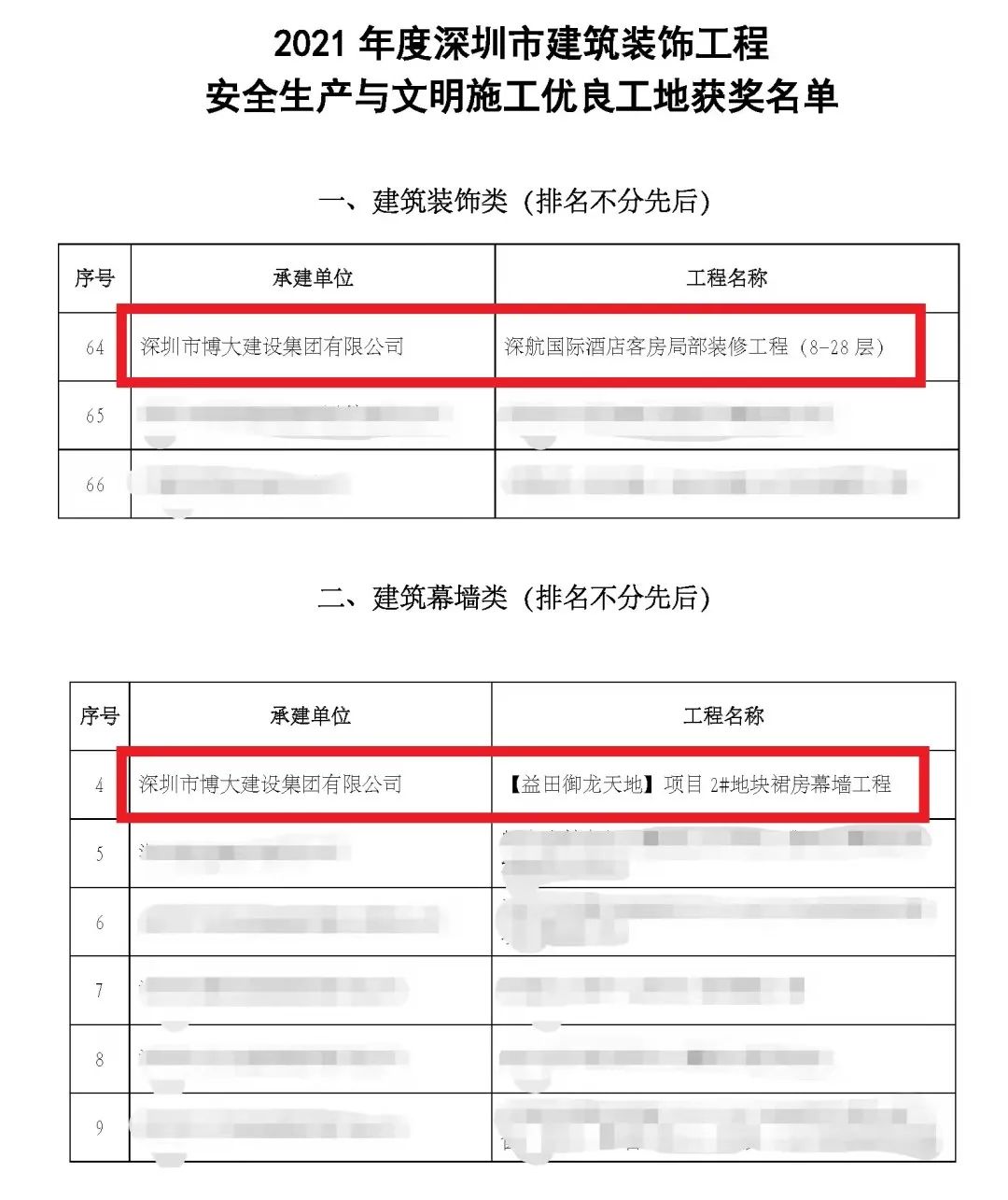 博大建設集團榮獲兩項深圳市建筑裝飾工程安全生產與文明施工優良工地