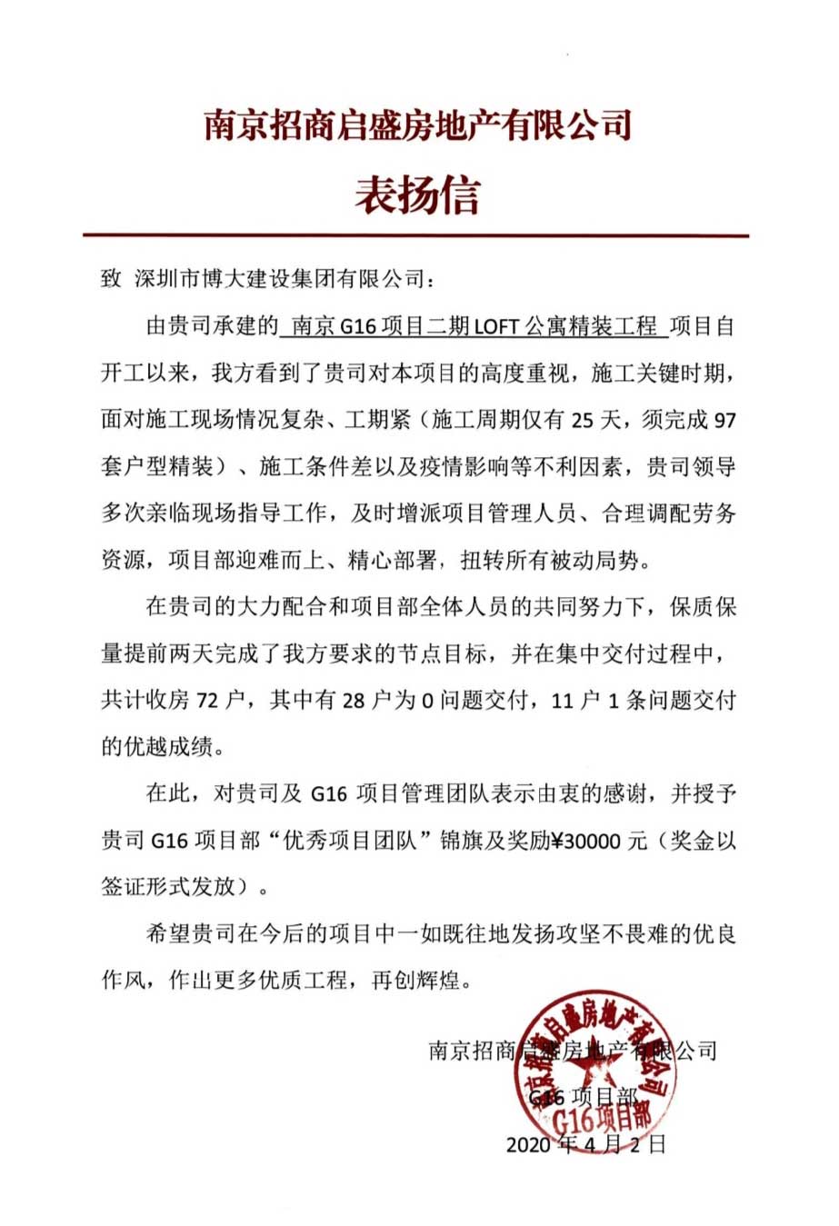 博大建設(shè)集團(tuán)在南京G16項(xiàng)目二期LOFT公寓精裝工程中,迎難而上,積極解決工期問題,以高標(biāo)準(zhǔn)的質(zhì)量,提前完成節(jié)點(diǎn)目標(biāo),受到客戶的表揚(yáng),并榮獲“優(yōu)秀項(xiàng)目團(tuán)隊”榮譽(yù)。