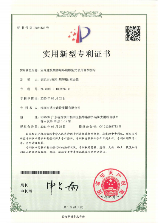專(zhuān)利成果分別是《室內(nèi)建筑裝飾用環(huán)繞螺旋式頂升調(diào)節(jié)機(jī)構(gòu)》、《一種GRG吊頂安裝結(jié)構(gòu)》、《一種PC預(yù)制混凝土構(gòu)件下的特大推拉窗》、《一種帶有支撐構(gòu)件的超大空間頂轉(zhuǎn)換層結(jié)構(gòu)》、《一種單元拼接式鋁板吊頂或裝飾線條》等22項(xiàng)獲得由國(guó)家知識(shí)產(chǎn)權(quán)局頒發(fā)的專(zhuān)利證書(shū)。